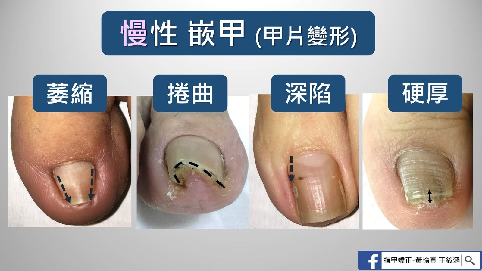 這群病患的【甲片】可以是捲曲 (C型彎度)、變小萎縮、垂直深陷、變硬變厚的指甲片變形。