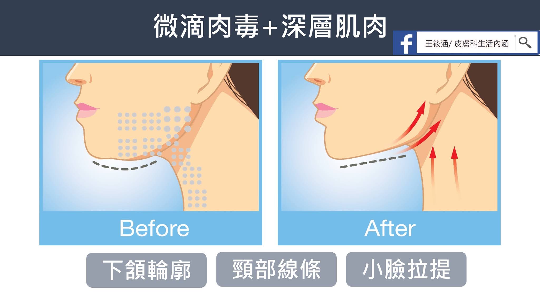 - 提升皮膚膚質,微滴肉毒 (Microbotox) [1,2] 施打方式,提升臉部線條、皮膚緊緻感,放鬆闊頸肌肉的埃及王后拉提(Nefertiti lift) [1,3] ,抑制頸部肌肉往下拉扯的拉力,讓整體線條往上拉提緊實。